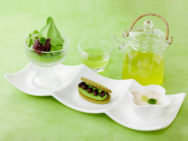 抹茶ソフトクリーム、リーフクッキーを使った抹茶バターサンド、ほうじ茶のパンナコッタを新茶と共に楽しむ、お茶のセット。